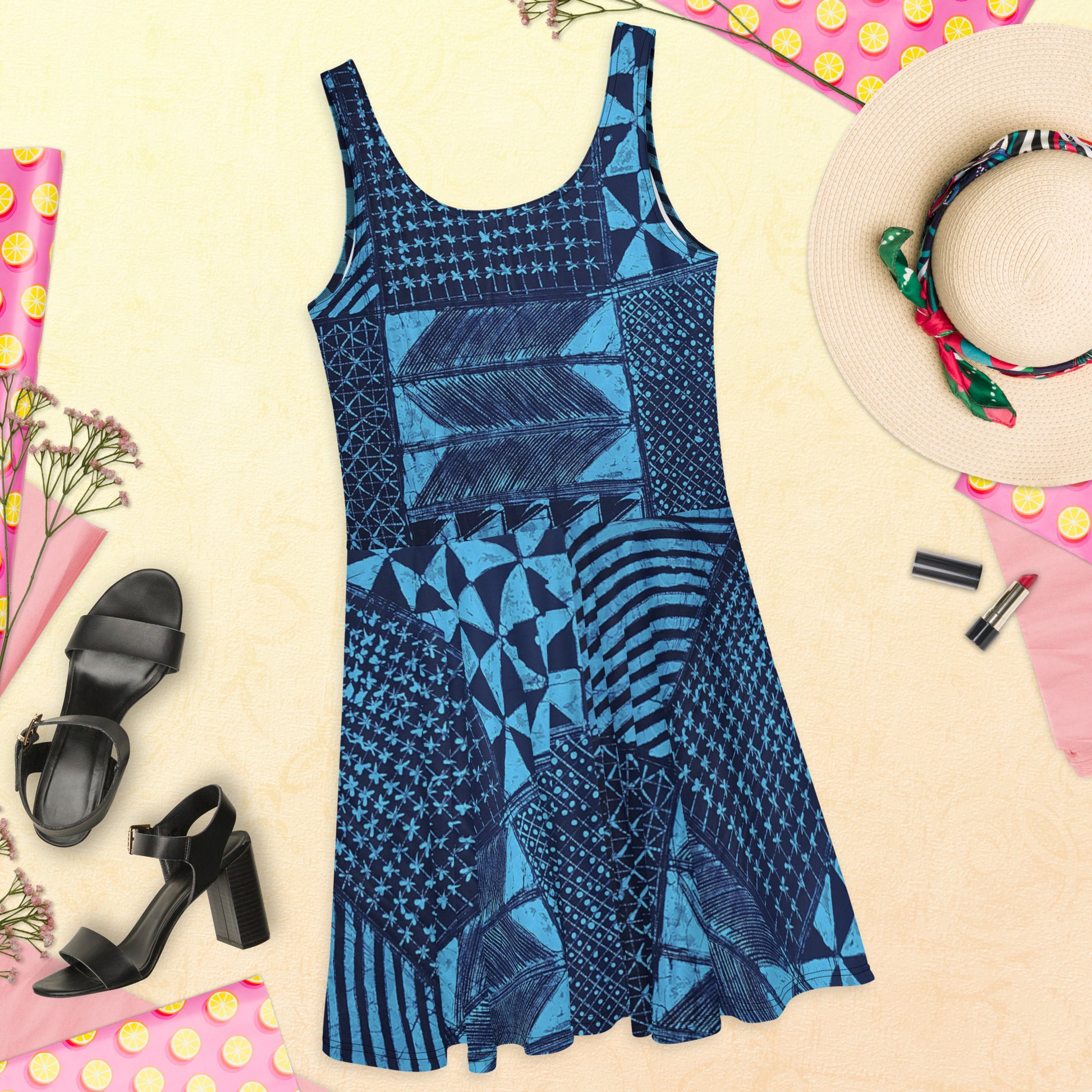 Black And Turquoise Shapes Adire Skater Dress